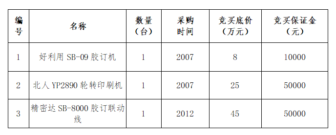 本項(xiàng)目采取公開拍賣的方式,各舊設(shè)備競(jìng)買底價(jià)和競(jìng)買保證金詳見上表。